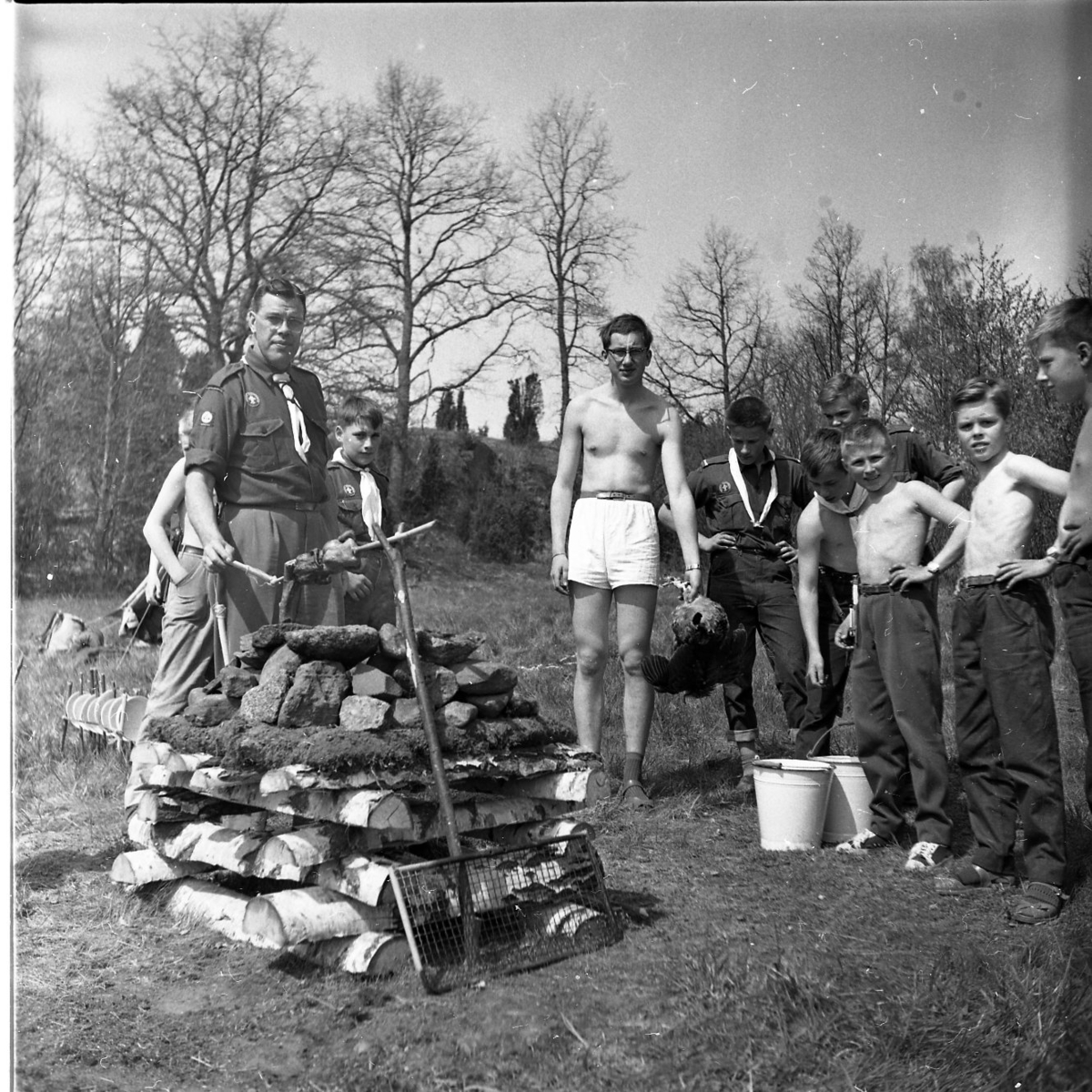 En scoutledare står vid en trave staplad ved med stenar på toppen, en grillad fågel sitter på ett spett över stenarna. Bredvid scoutledare står flera barbröstade pojkar, en pojke håller en död fågel i handen. I bakgrunden syns träd och buskar.
