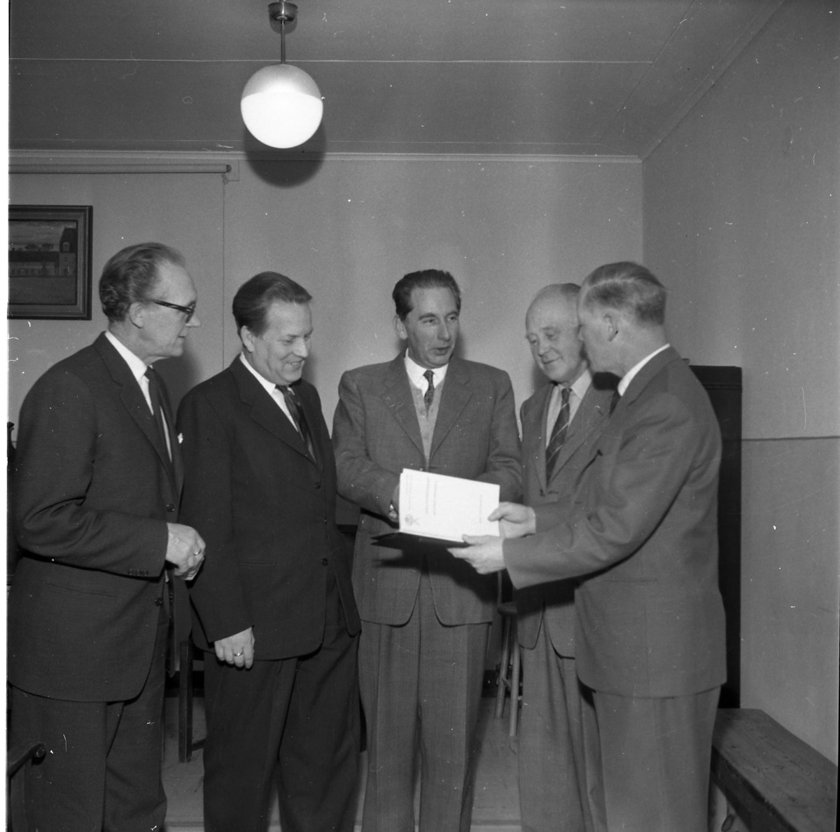Fem kostymklädda män står tätt bredvid varandra och pratar. En av männen håller i en bunt med papper.