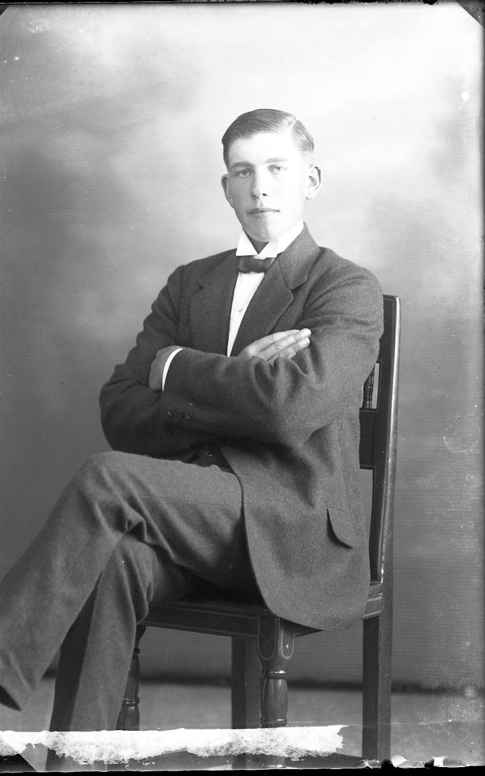Porträtt av en yngling i kostym och fluga. Han sitter på en stol med armarna i kors.