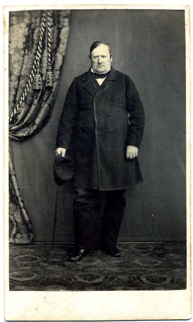 Kabinettsfotografi av en man i rock. Han håller en käpp och keps i höger hand.