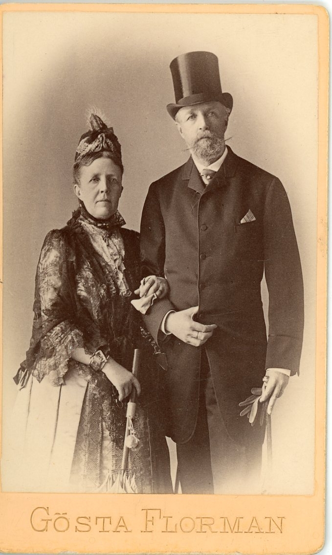 Kabinettsfotografi av en högtidsklädd kvinna och man, de håller armkrok. Kvinnan håller ett parasoll och mannen bär hög hatt.