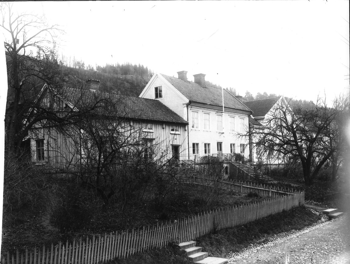 Brahegatan med bebyggelse på dess östra sida. Närmast i bild en trädgård inhägnad med staket med omväxlande hög/kort spjäla. Gatan belagd med kullersten.