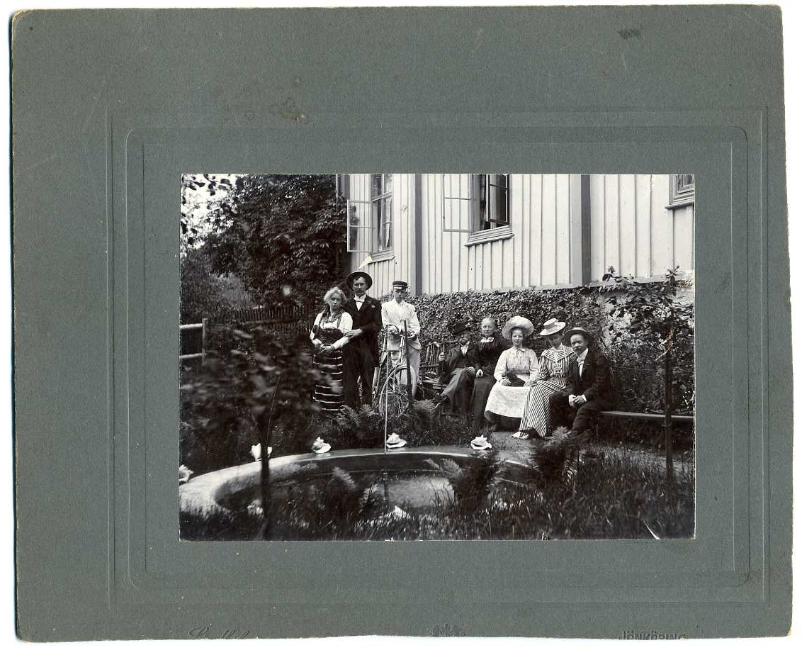 En grupp står och sitter framför en större byggnad med träpanel. En pojke står med en cykel. Fontän i förgrunden med snäckskal liggande runt dammen.