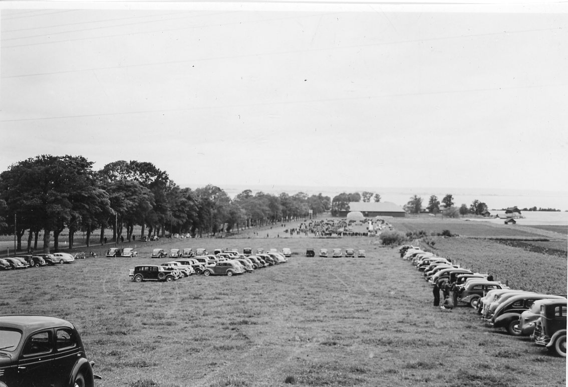 Ett stort antal bilar parkerade i rader på ett gärde strax norr om Gränna, mot Vättern.