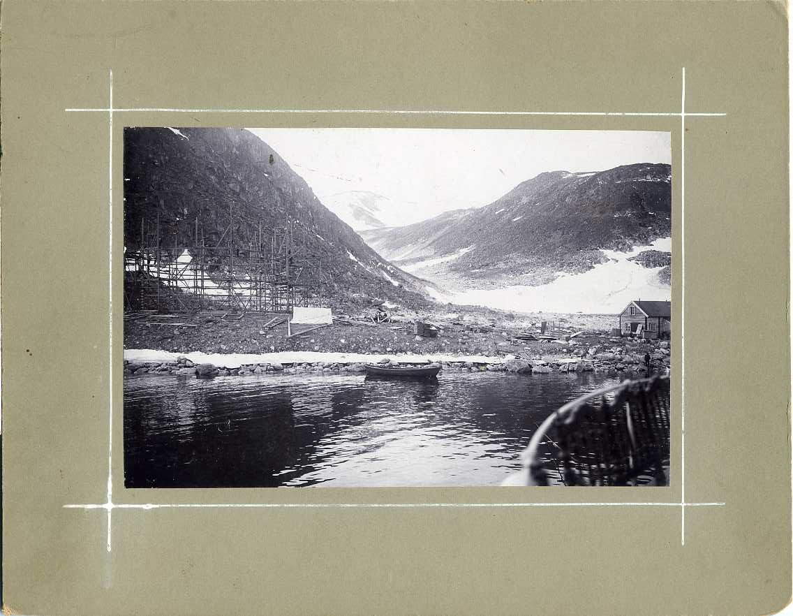 Fotografi från ångaren Virgo med Danskön där ballonghuset är under uppförande. Ett tält står rest hitom detsamma. Pikes hus till höger.