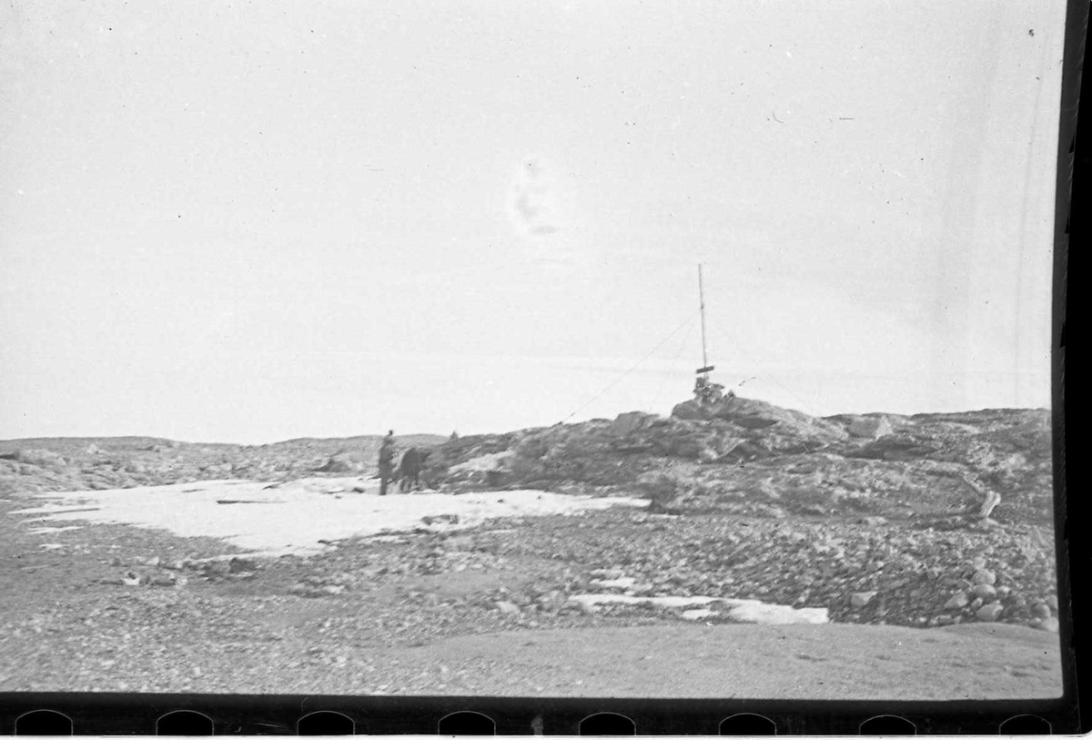 Titel: Besättningsmän från Isbjörn i arbete med utgrävning av Andréeläget på Vitön. Till höger Horns varde som markerade platsen för fyndet.