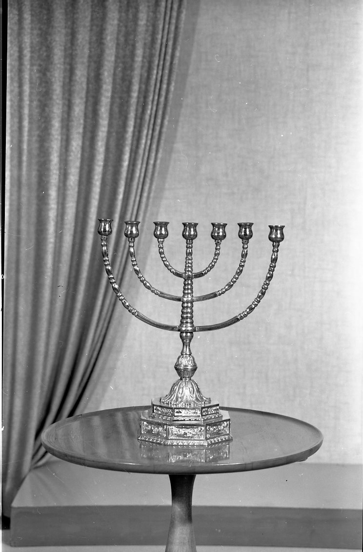 En 7-armad ljusstake i mässing står på ett runt bord. Produktfotografering för Bollings Eftr.