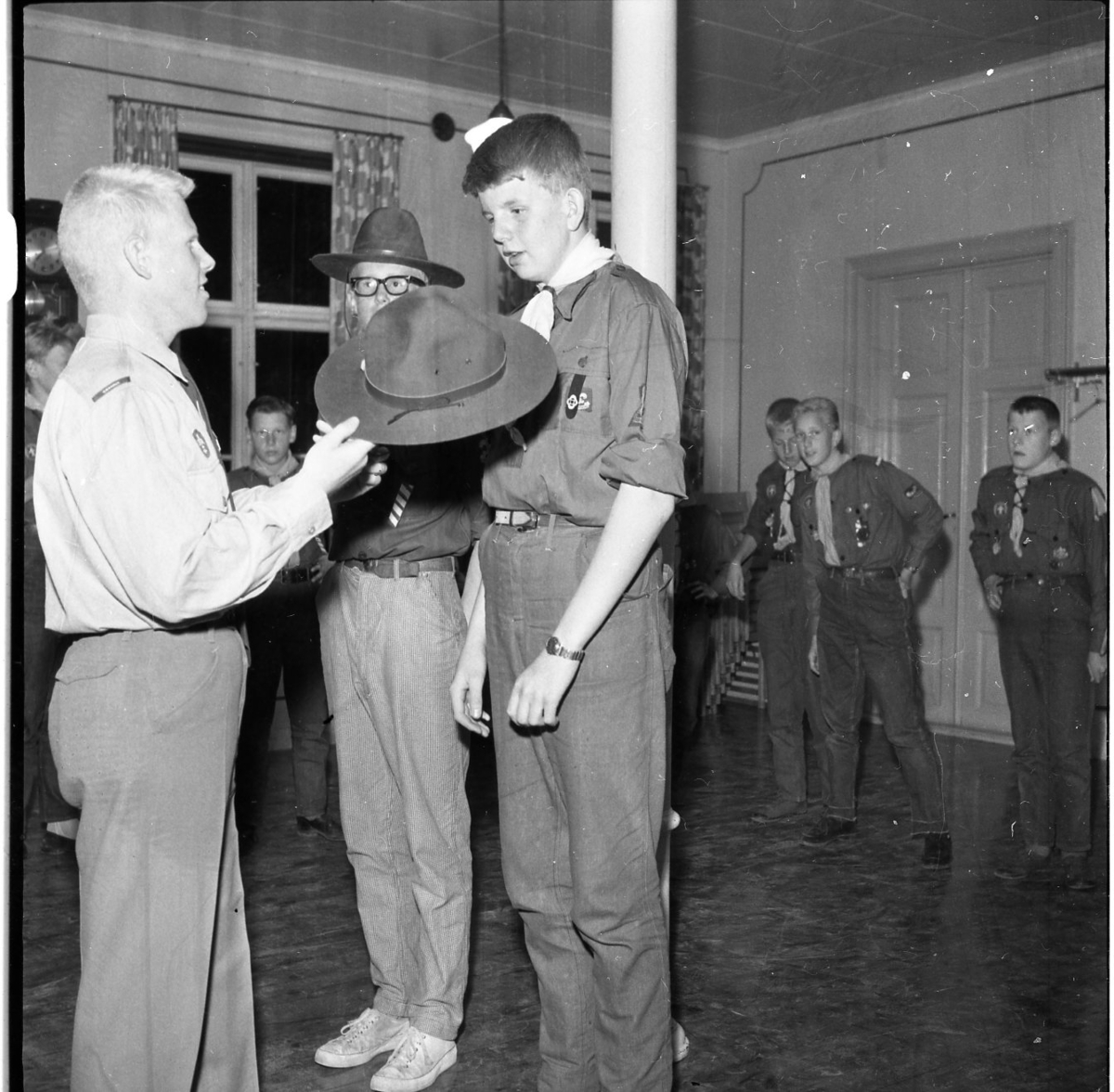 En ung kille står och räcker över en scouthatt till en annan ung kille. Bredvid dem står en kille som redan bär en scouthatt på huvudet. Bakom dem står andra scouter och tittar på.