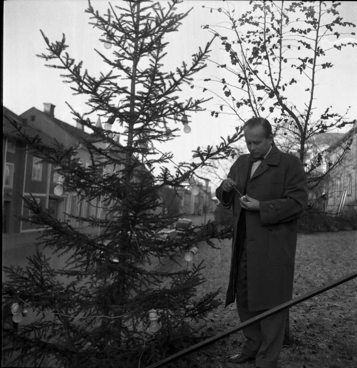 En man står och sätter upp en ljusslinga i en gran utmed Brahegatan. Han håller något i händerna som han skruvar på. De är utomhus och i bakgrunden syns en husfasad. Det är eventuellt någonstans längst med Brahegatan i Gränna.