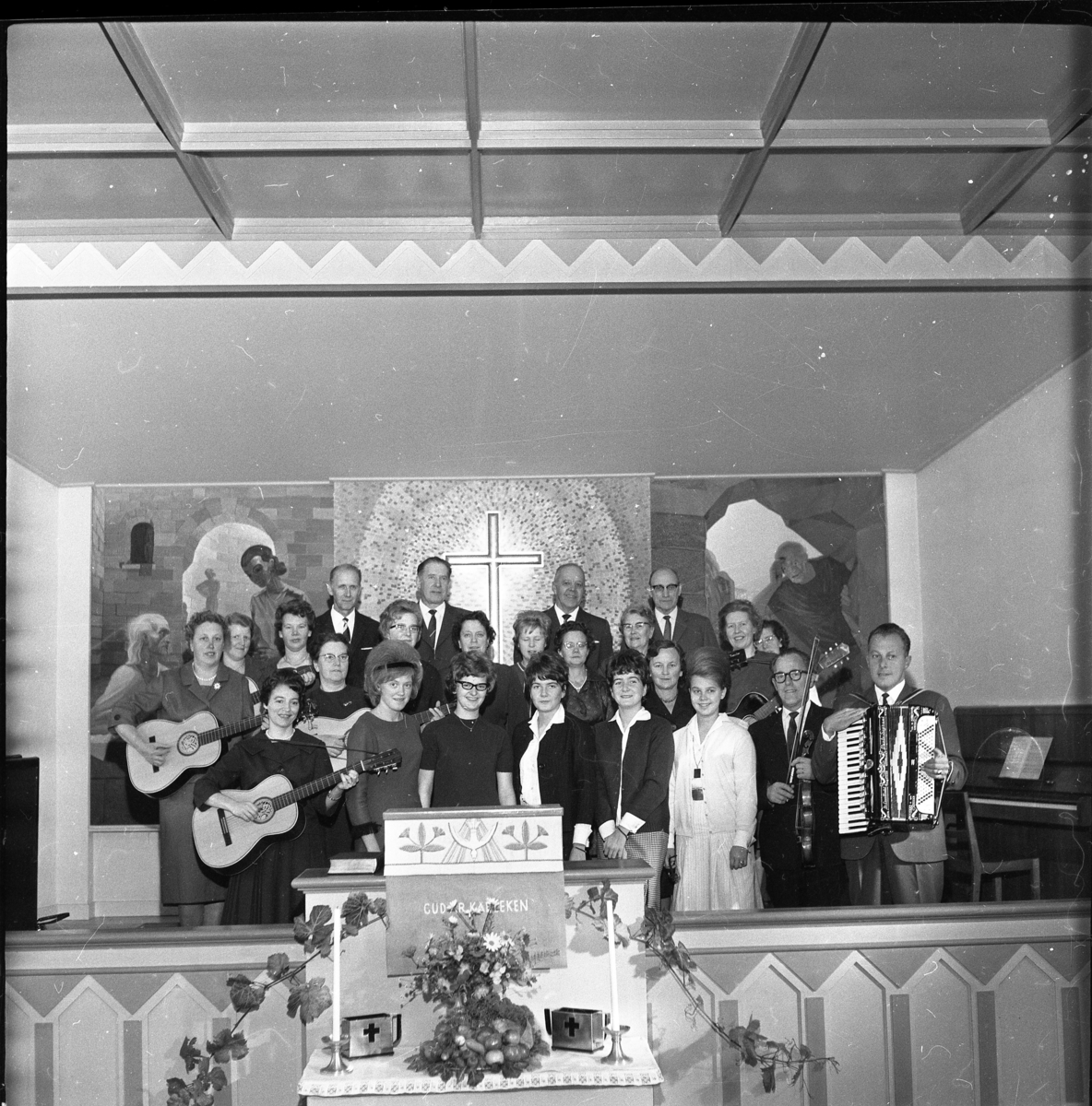 Gränna Missionskyrkans sångkör. Främre rad fr v: Kerstin Midnäs, Marianne Martini, Annika Isaksson, tvillingarna Gullvi och Gunnel Danielsson, Inger Wetter, Helmer Karlsson samt Ingmar (Bagarn) Johansson. Mellanraden fr v: Märta Jonsson, Ingrid Rendahl, Maj Hermansson, Lilly Lago, Sonja Fransson, Eva Karlsson, Britt-Marie Carlsson, Berta Wetter, Märta Johansson, Anna Jansson med mörkt halsband, Britta Blixt samt Evy Jonsson. Bakre raden fr v: Arvid Lundbom, Henry Jansson, Johan Johansson samt Oskar Mellin