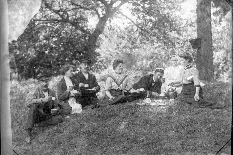 Tre män och fyra kvinnor sitter och ligger på en gräsyta och dricker kaffe. Kvinnan till höger heller upp till en man som troligen är något befäl. En annan kvinna räcker fram sin kopp får påtår.