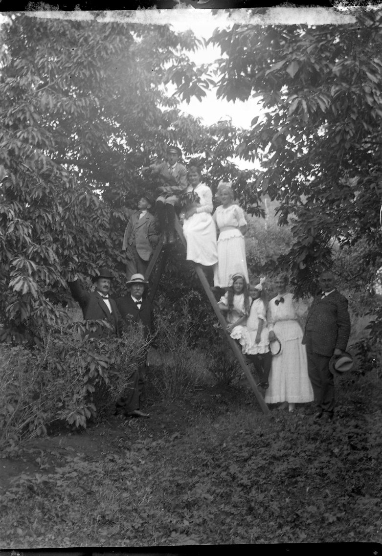 Barn och vuxna samlade runt en trappstege bland träd i en trädgård. Några ungdomar står högst upp på stegen. Någon av dem heter Hägerström.