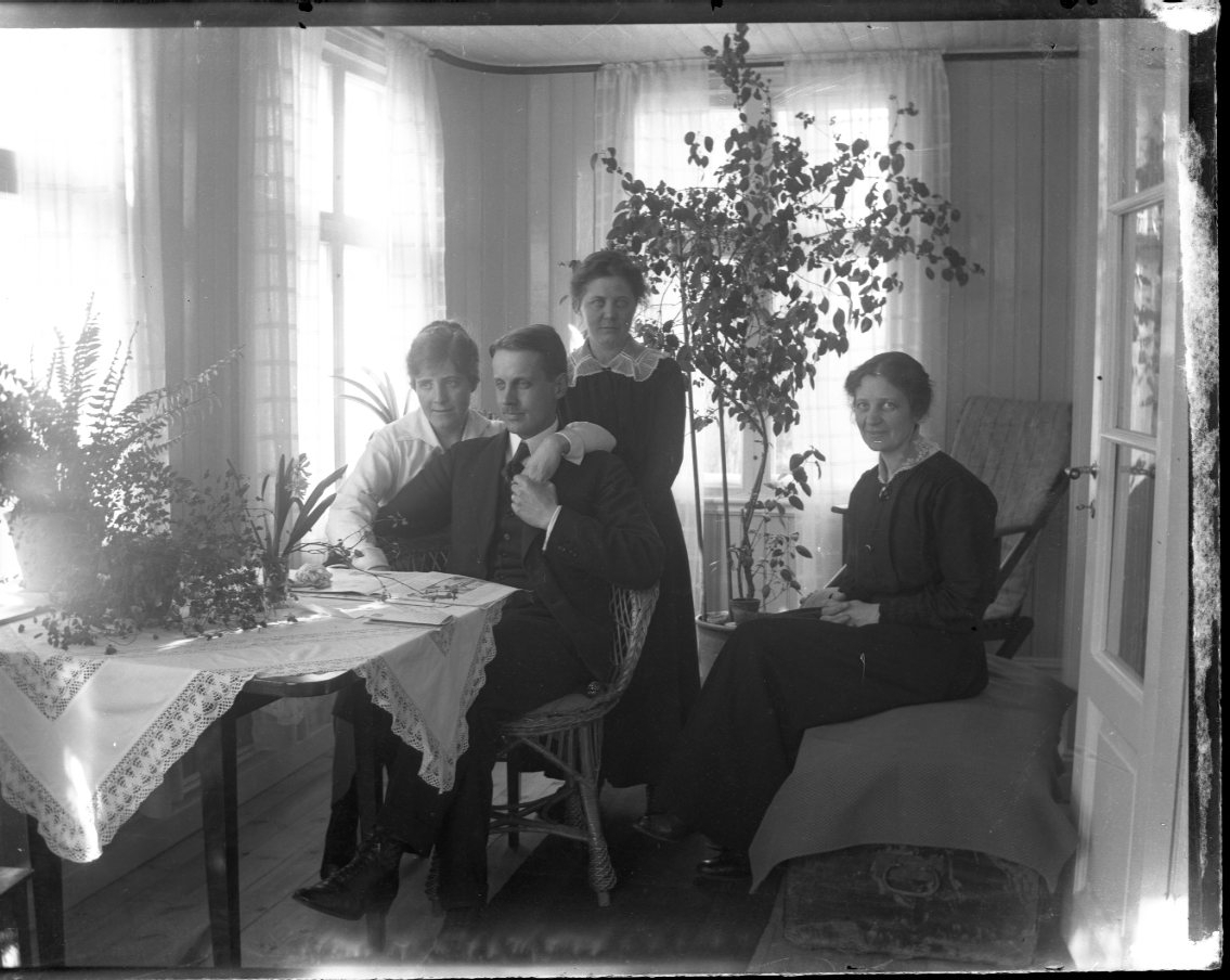 En man och kvinna i ljus blus sitter intill varandra, hon har vänster arm och hans hals. De håller varandras hand. Bakom dem står och sitter två kvinnor, i mörka klänningar. De sitter möjligen i en inglasad veranda.