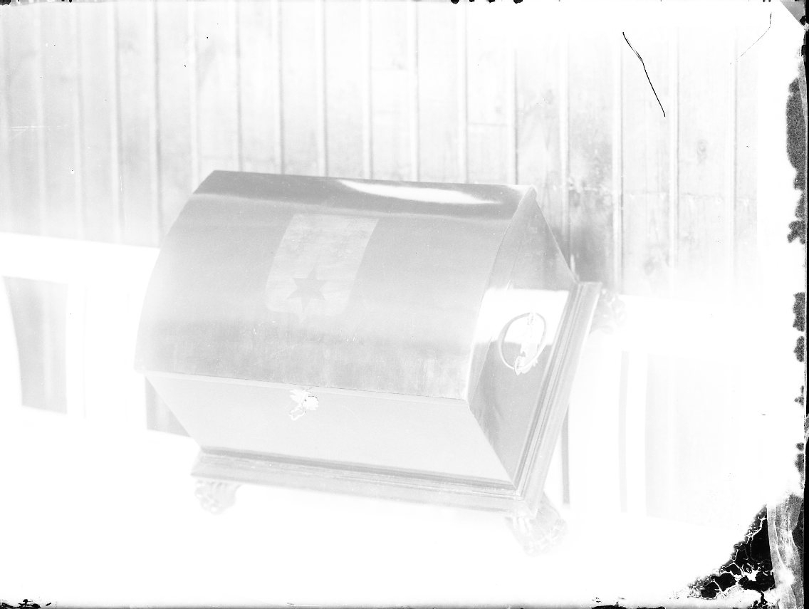 En mindre kista - typ skråkista - med välvt lock och Grännas stadsvapen. Placerad vinklad på en träsoffa.