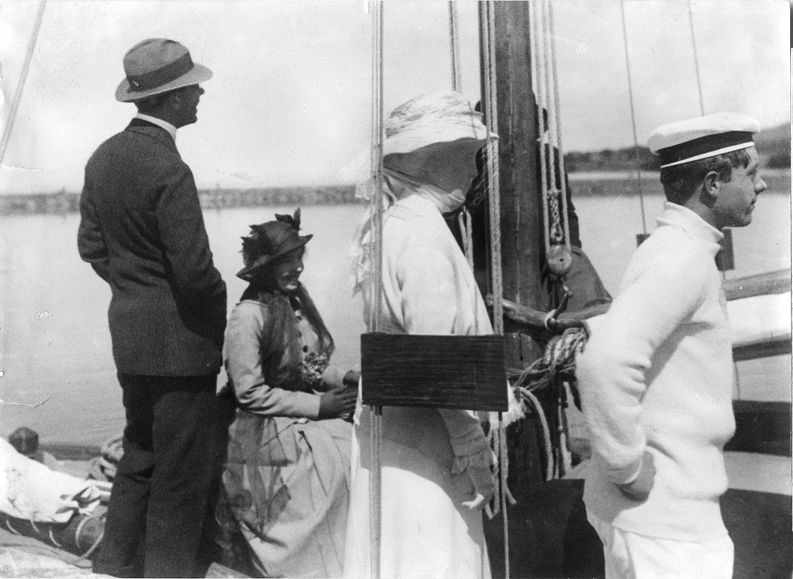 Kronprinsparet Gustav Adolf och Margaret till vänster på von Dübens motorseglare Blenda. I mitten med flor för ansiktet står Mary Lambert, gift von Düben. Sjömannen/gasten till höger är möjligen Carl Wahlberg.