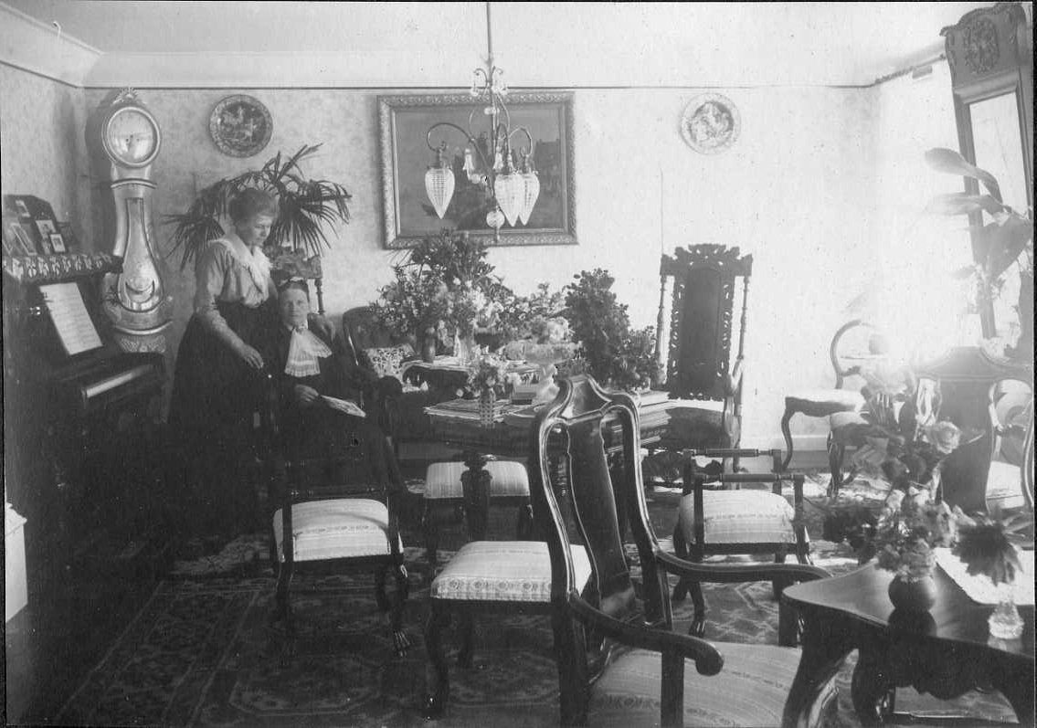 Interiör från ett hem. En kvinna står bredvid en äldre kvinna som sitter i stol med hög rygg. Ett golvur i ett hörn bakom dem samt ett piano till vänster. Fönster och en hög väggspegel till höger.