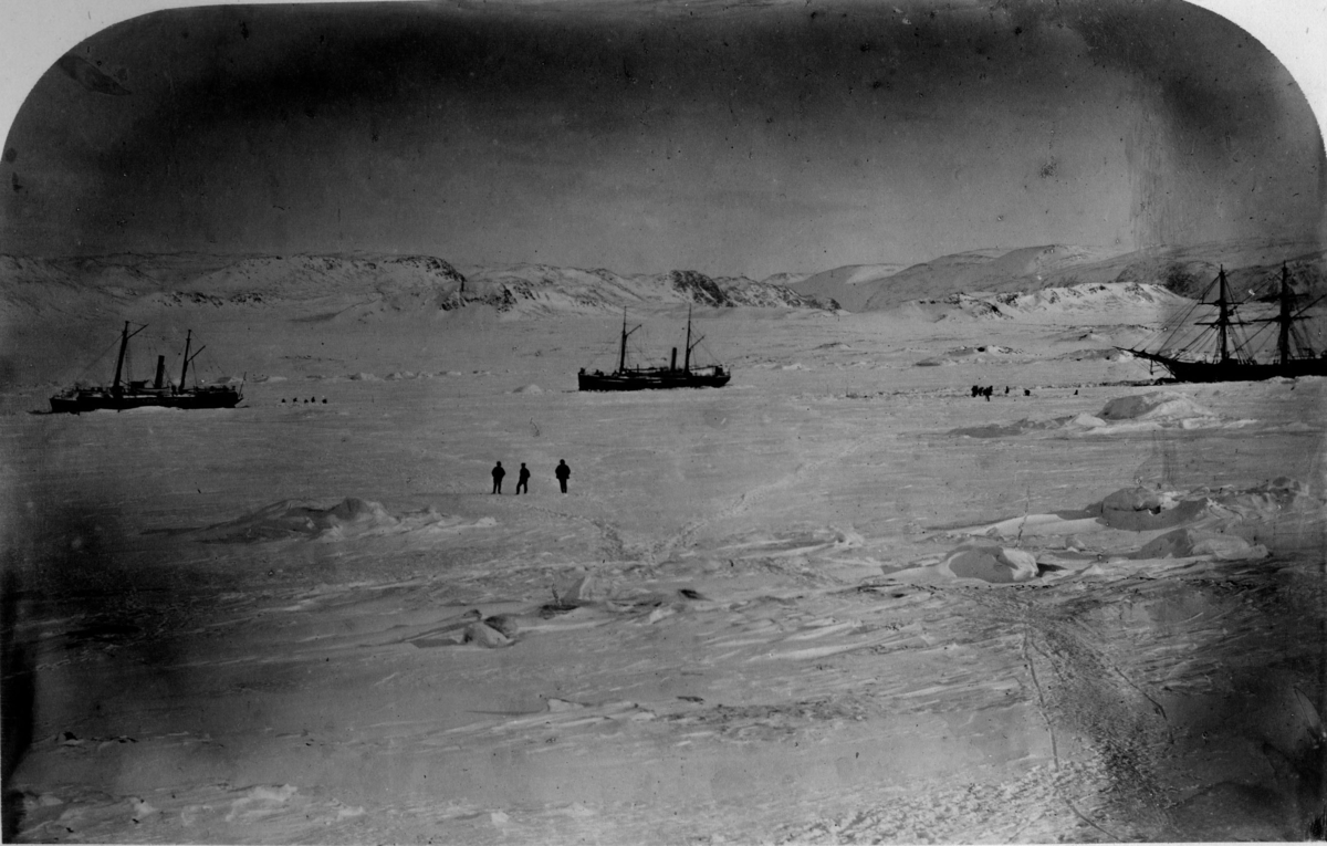 "Fartygen i vinterquarter i Mosselbay, folket sysselsatt med upptagande af de under stormen d.29 Jan. förlorade ankaren. d.6 April 1873 Axel Enwall."
