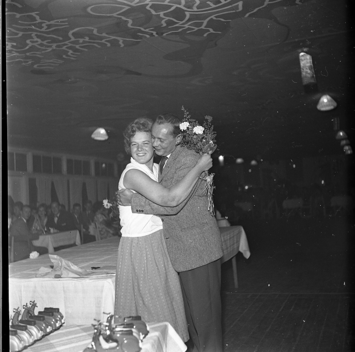 En man och en kvinna kramas. Kvinnan håller en bukett blommor.