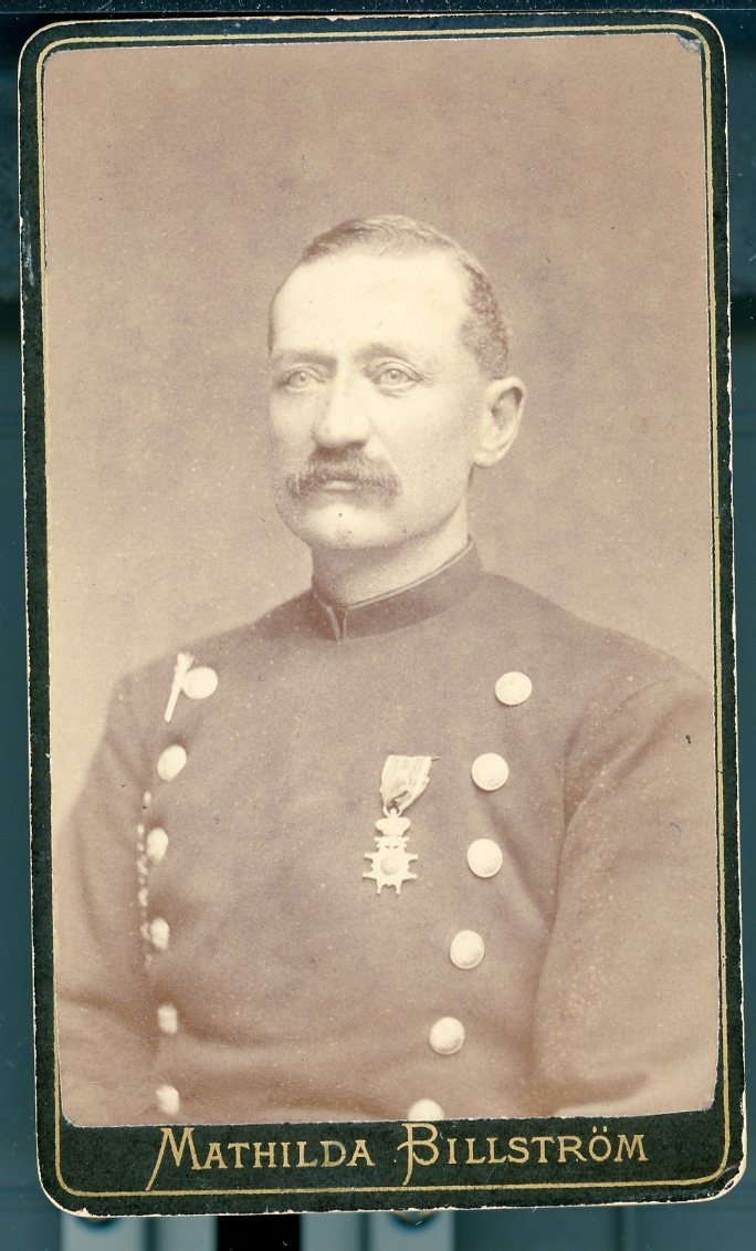 Kabinettsfotografi: A W Hall i uniform med medalj på bröstet.