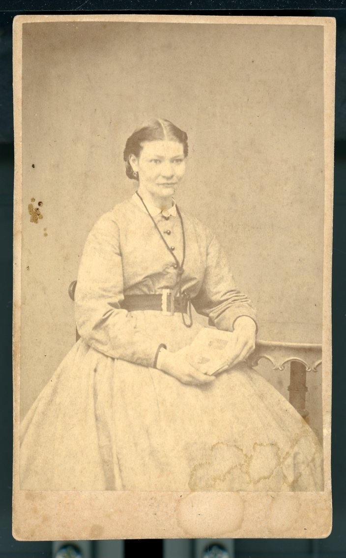 Kabinettsfotograf: Ida Hall med fotoalbum (?) i händerna sittande vid ett bord.