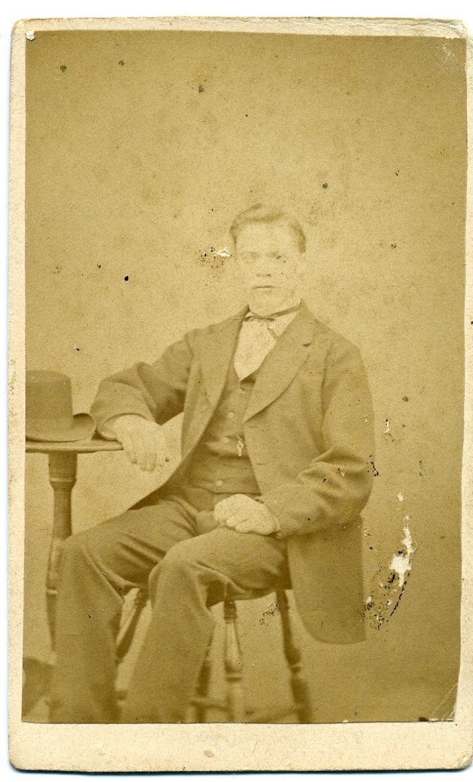 Kabinettsfotografi: porträtt av okänd man som sitter i en stol.