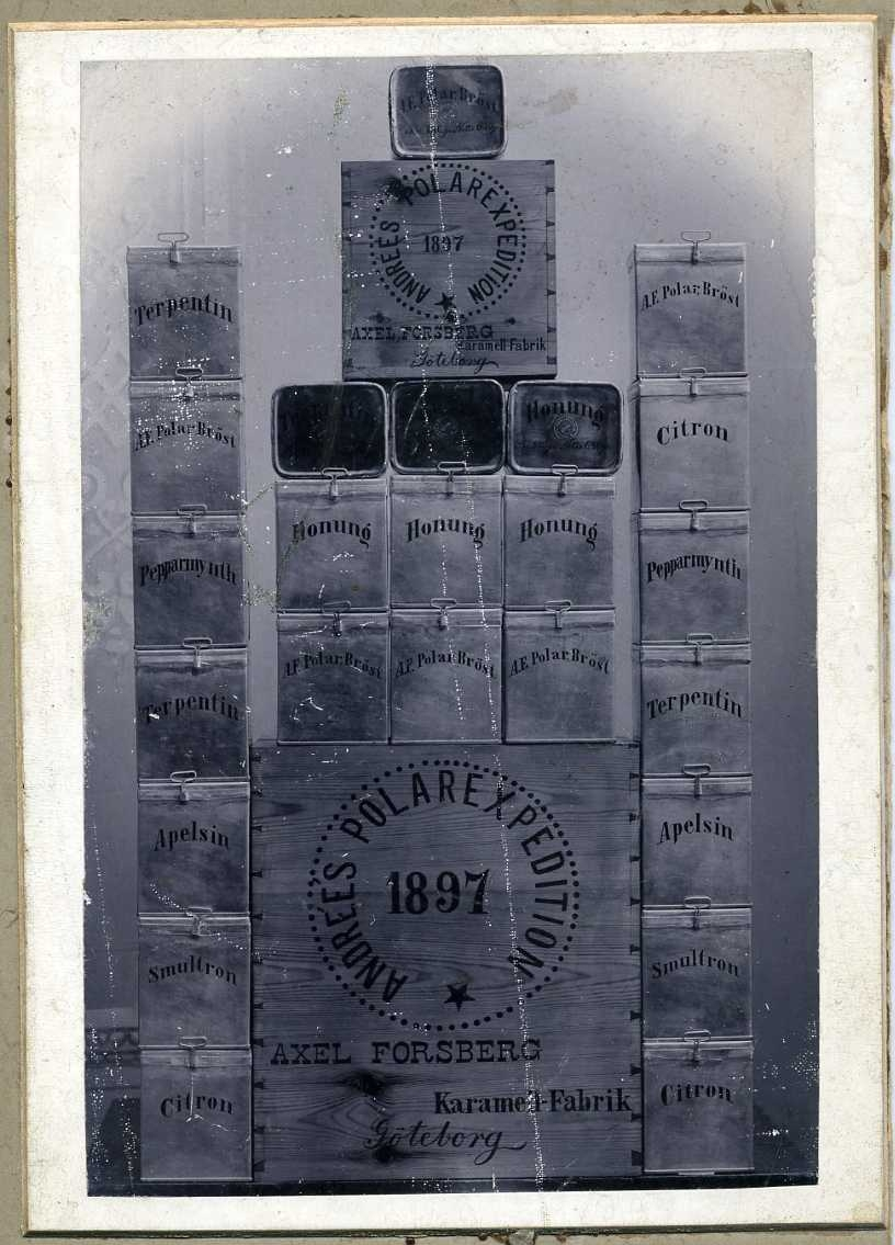 Ett stort antal mindre plåtaskar stående intill och på en större och en mindre trälåda. Plåtaskarna är märkta "Terpentin", "A. F. PolarBröst", "Citron", "Pepparmynth", "Apelsin", "Smultron" och "Honung". Trälådorna är märkta "Andrées Polarexpedition 1896 Från Axel Forsberg Karamell-