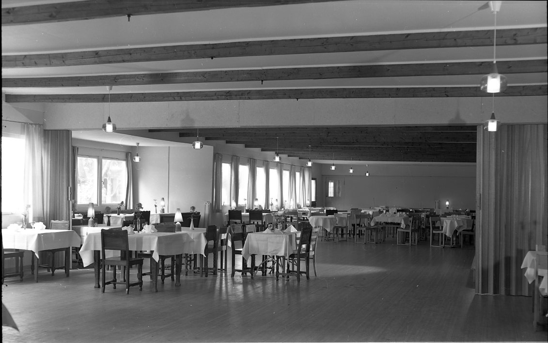 Dukade bord i en stor matsal, en stor vikbar dörr delar av rummet.