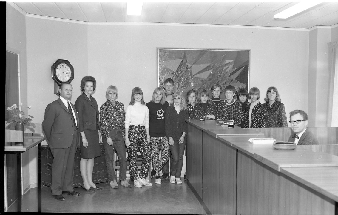En grupp elever från Handelsskolan i Gränna på Smålands Bank. Mannen till vänster intill okänd kvinna är läraren Allan Berggren. Vid disken sitter kamrer Urban Holmén.
