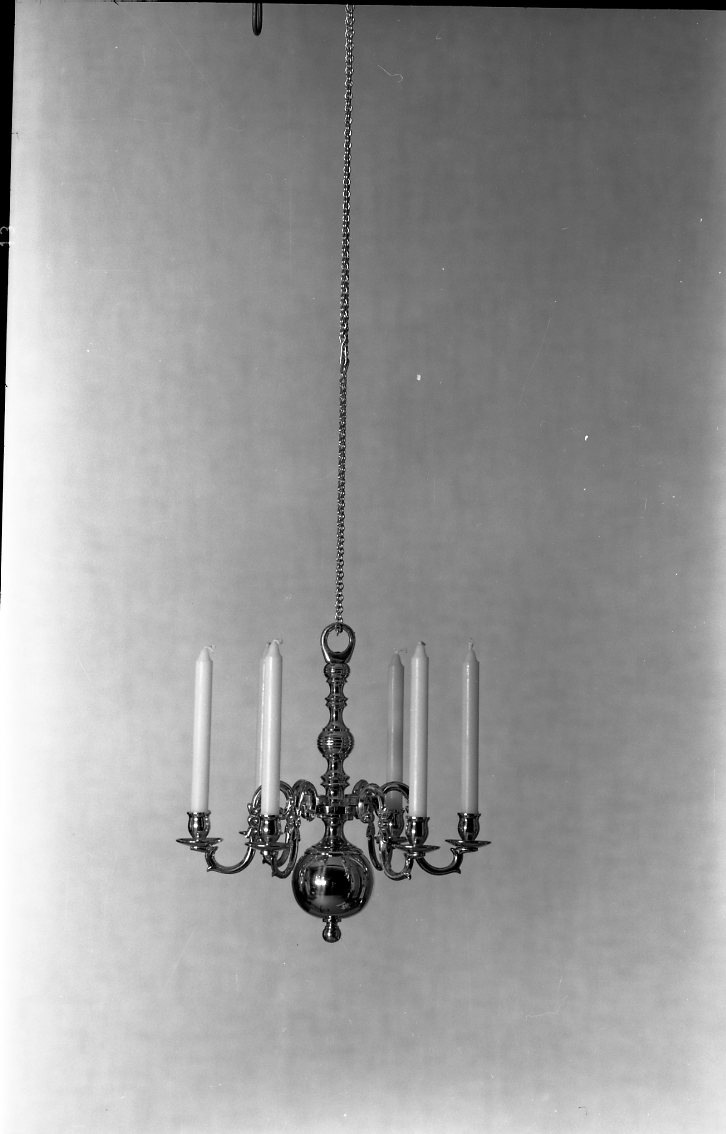 En liten ljuskrona i mässing med sex ljus hänger i en kedja.
