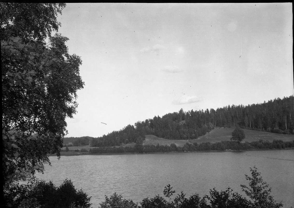 Landskap med en sjö i förgrunden.