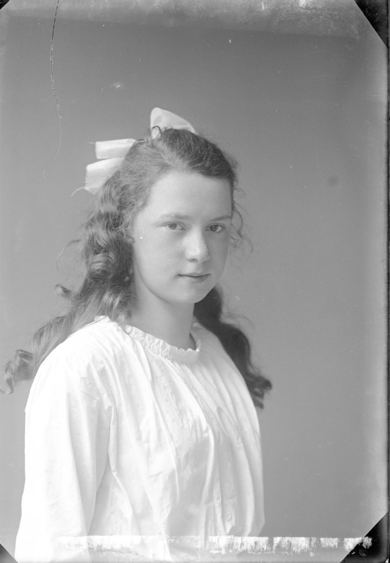 Porträtt av en flicka i tonåren. Hon har en rosett i håret.
