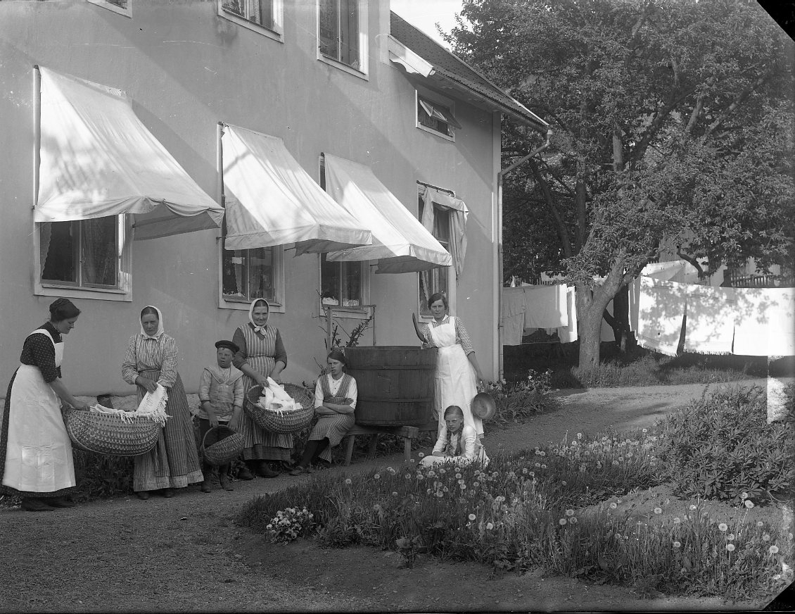 Kvinnor håller på med tvättning. Två stora korgar med tvätt och en stor rund byktunna. Två barn i sällskapet. De befinner sig på gårdssidan till ett putsat envåningshus med frontespis. I bakgrunden hänger tvätt på linor.