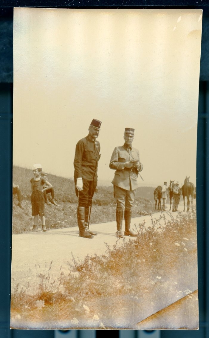 T Boije Hjertström med okänd (österrikisk-ungersk) officer till vänster. De står på smal grusväg. Några små pojkar till vänster och ridhästar i bakgrunden.