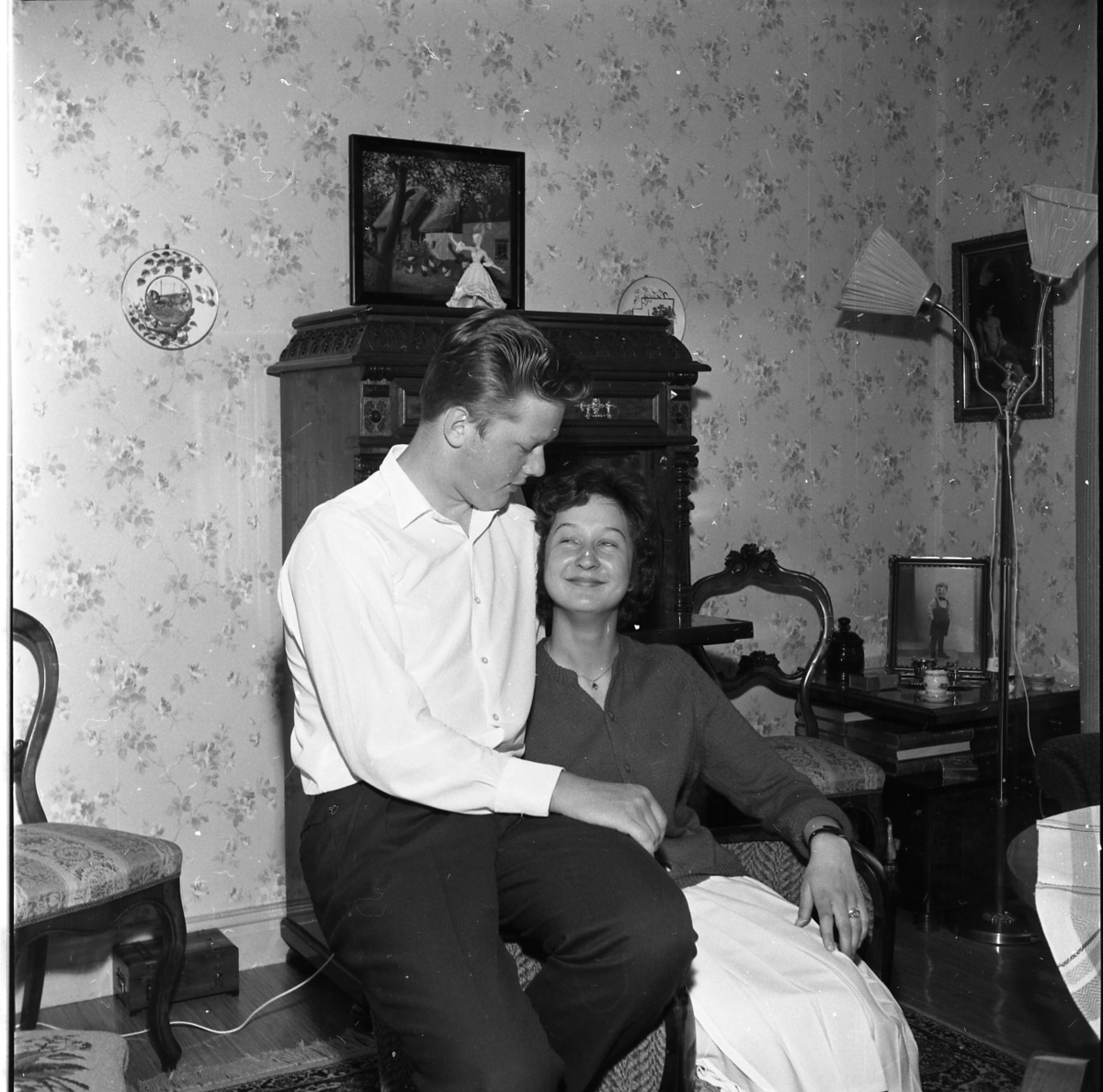En kvinna sitter i en stol. På stolens armlän sitter en man. De tittar på varandra.