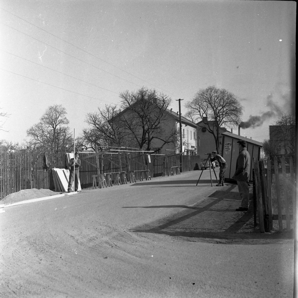 Män arbetar på Sjögatans södra del inför Gränna Lions marknad. Till höger i bild står en man vid ett nivelleringsinstrument och tittar mot marknadsstånd som håller på att uppföras. Närmast i bild, till höger, sannolikt Hans Roman.