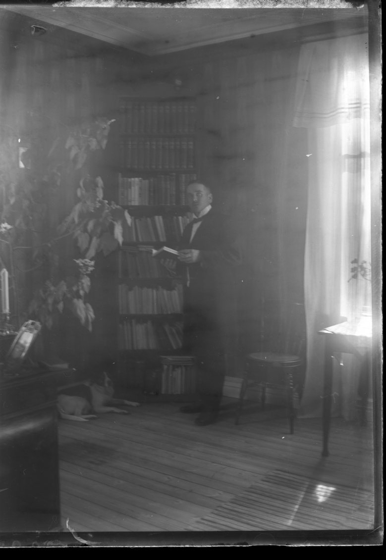 En man står med en bok i händerna vid en bokhylla full av böcker. Solen skiner in från höger.