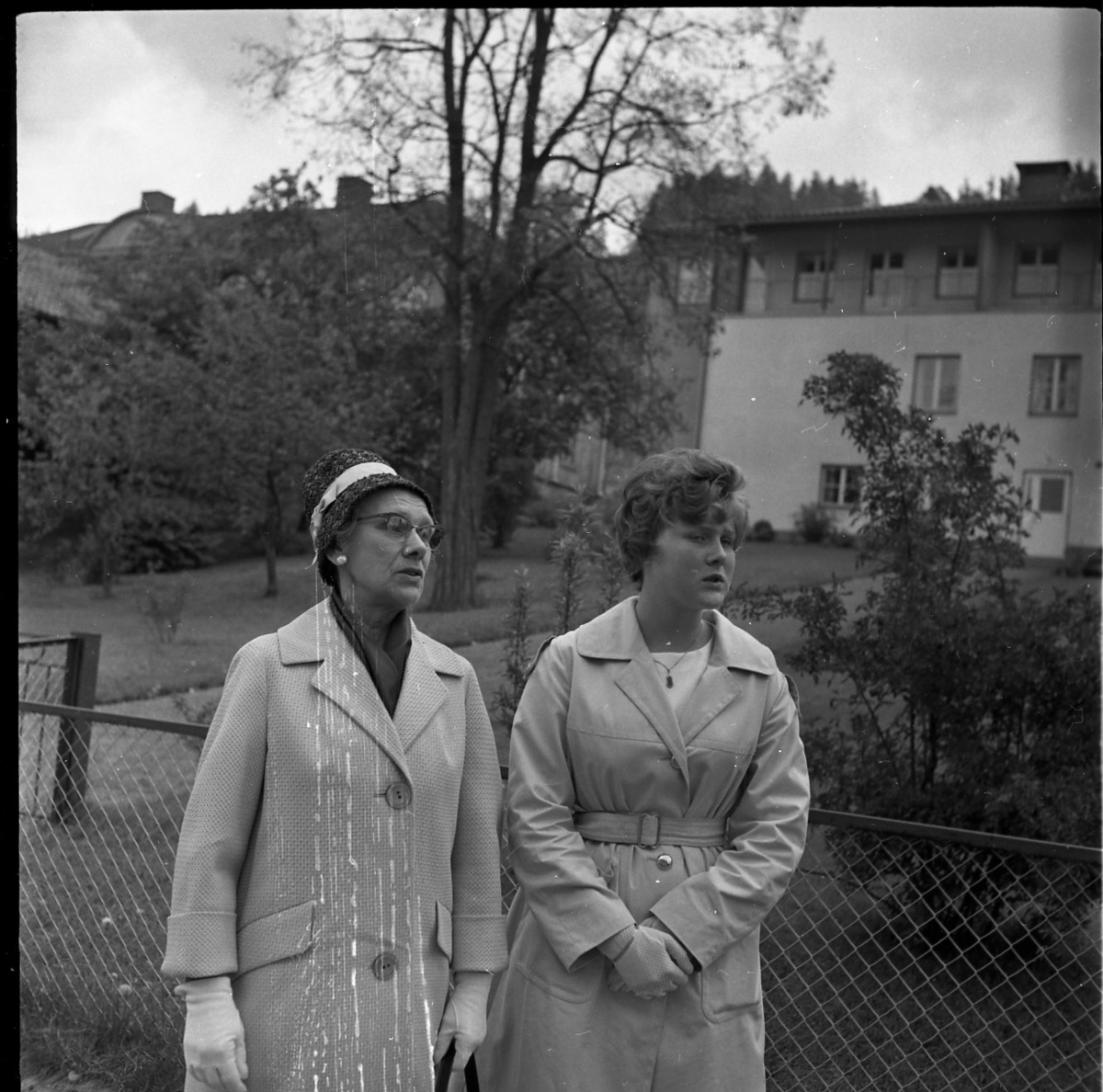 En äldre kvinna och en kvinnlig konfirmand står på Sjögatan i Gränna.