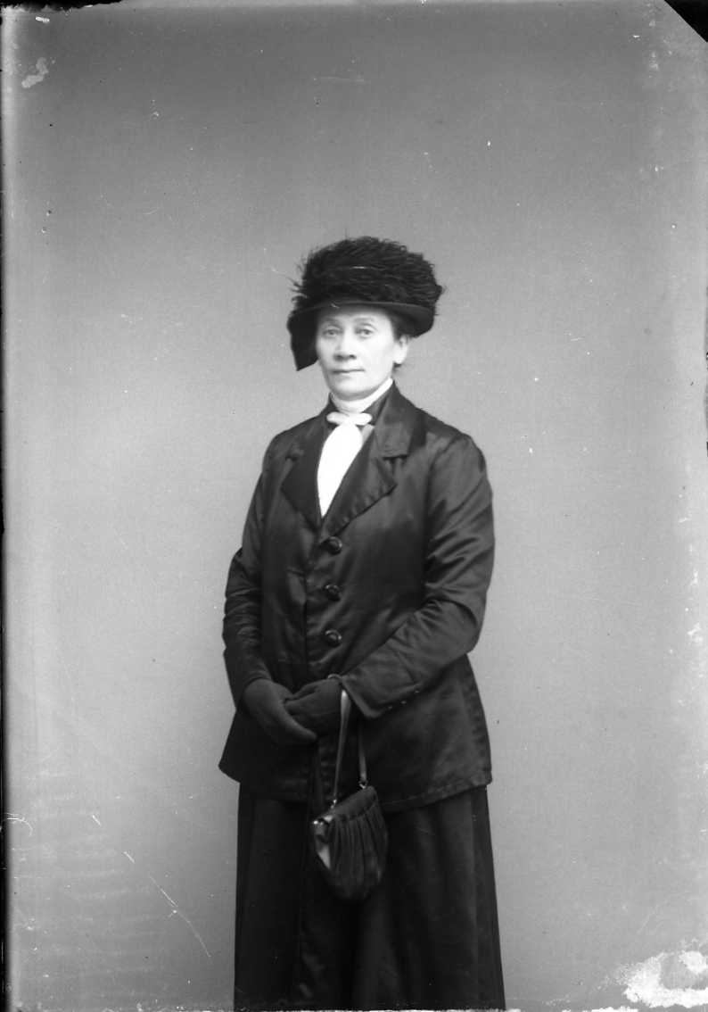 Porträtt av en kvinna i hatt och mörk dräkt.