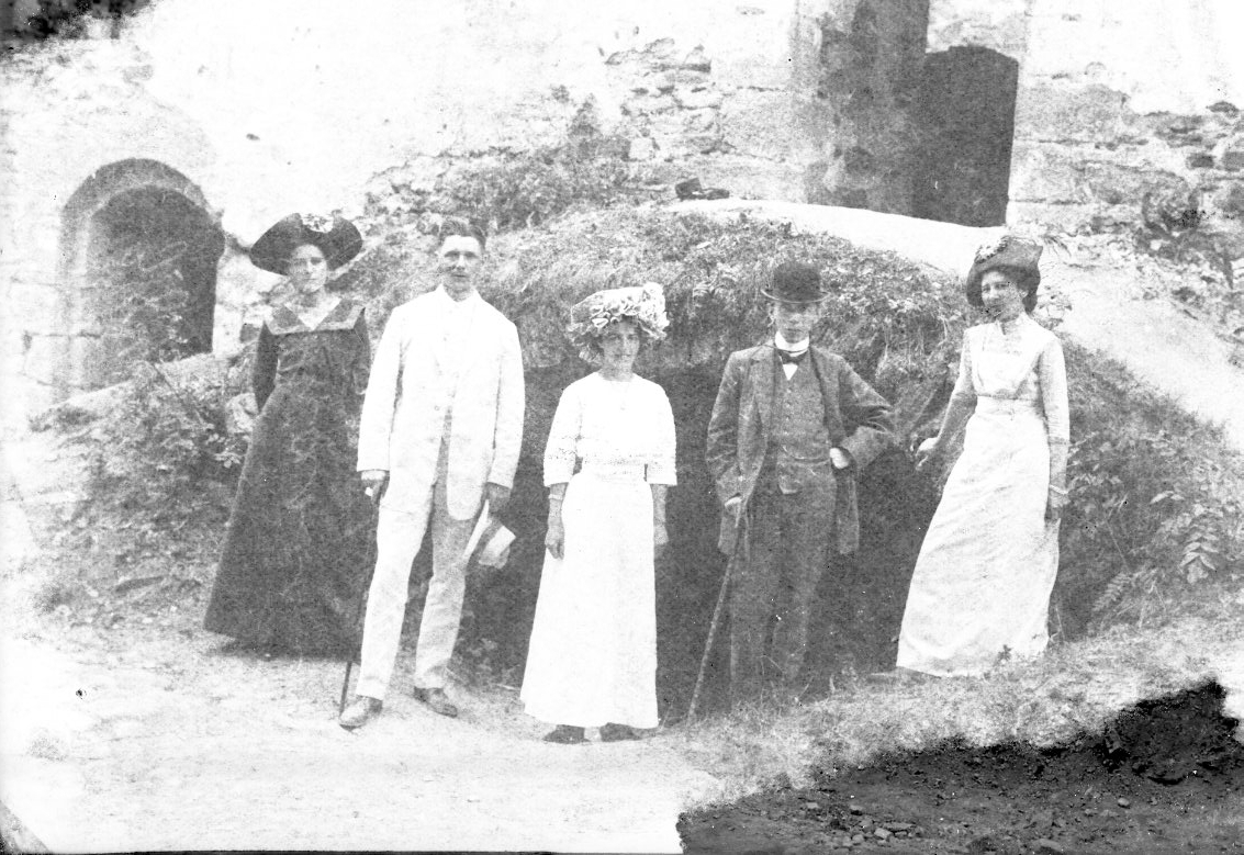 Fem unga kvinnor och män på Visingsborgs slotts inre borggård. Det är sommar.