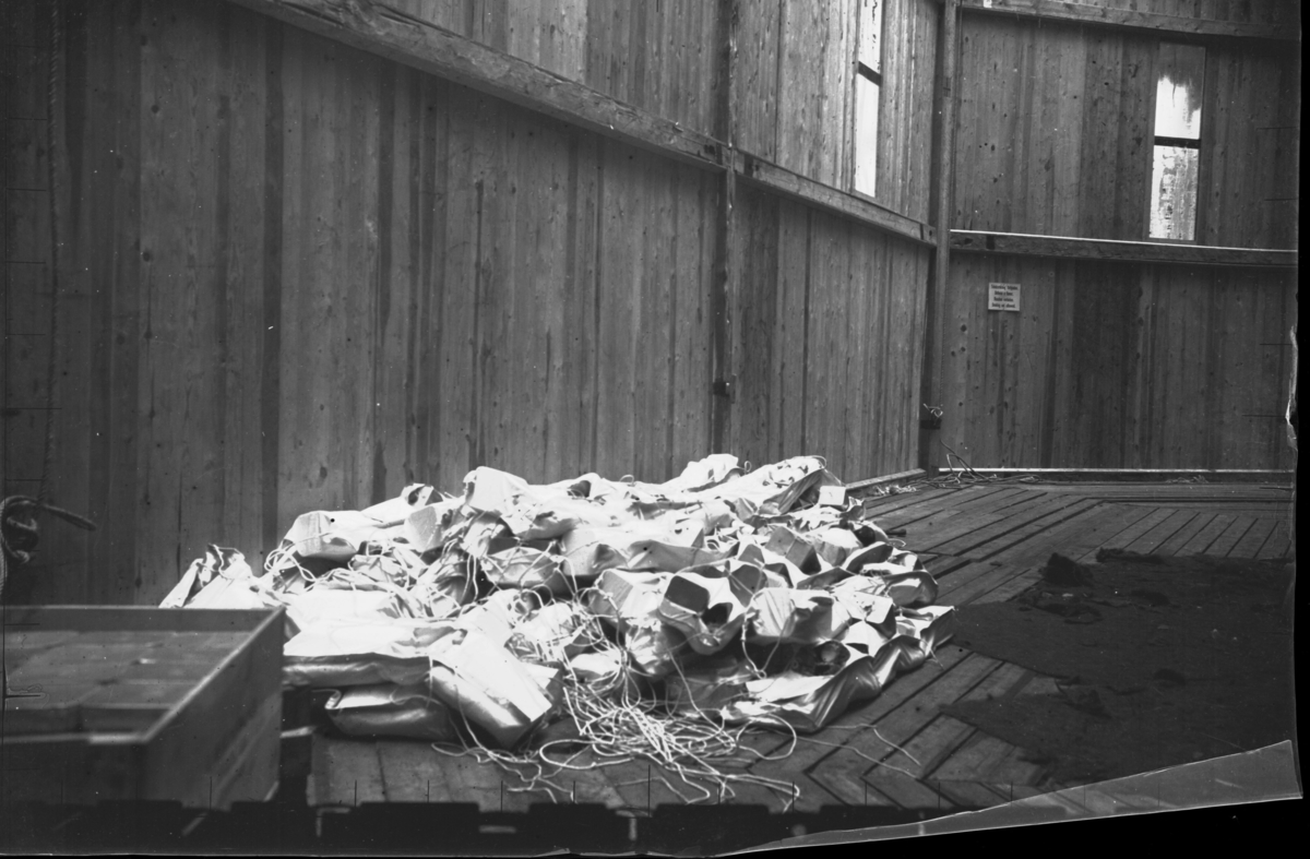 På golvet i ballonghuset ligger packfickor för expeditionens utrustning. De placeras i utrymmet ovanför bärringen - länken mellan ballong och ballongkort. Nitratnegativ.