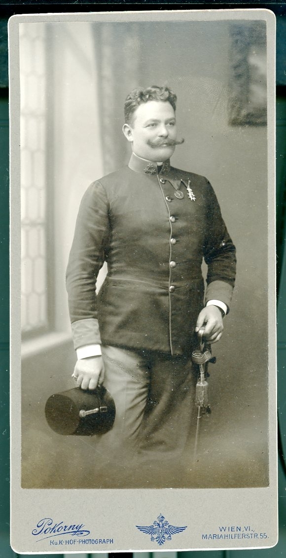 Kabinettsfotografi: Österrikisk-ungersk överste med stor mustasch och medaljer på bröstet. Uniformsmössan i ena handen och den andra på värjan.