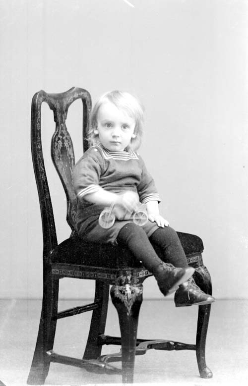 Åke Larsson-Ölmeskog, en liten pojk sittande på en stol med en leksabil eller cykel i handen.