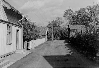 Sjögatan norrut mot dåvarande "Hjertströms gränd". Bostadshus närmast till vänster och längre fram en skarp högerkurva med ekonomibyggnader på bägge sidor om vägen.