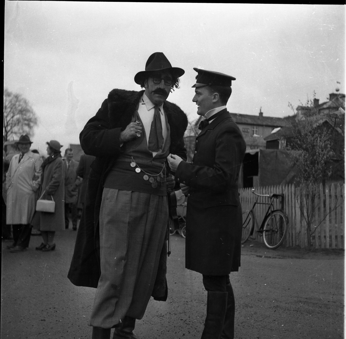 Två utklädda karaktärer står på norra delen av Sjögatan i Gränna. En folksamling i bakgrunden. Männen är Olle Mathias som "zigenare" och Hans Roman till höger som polis.