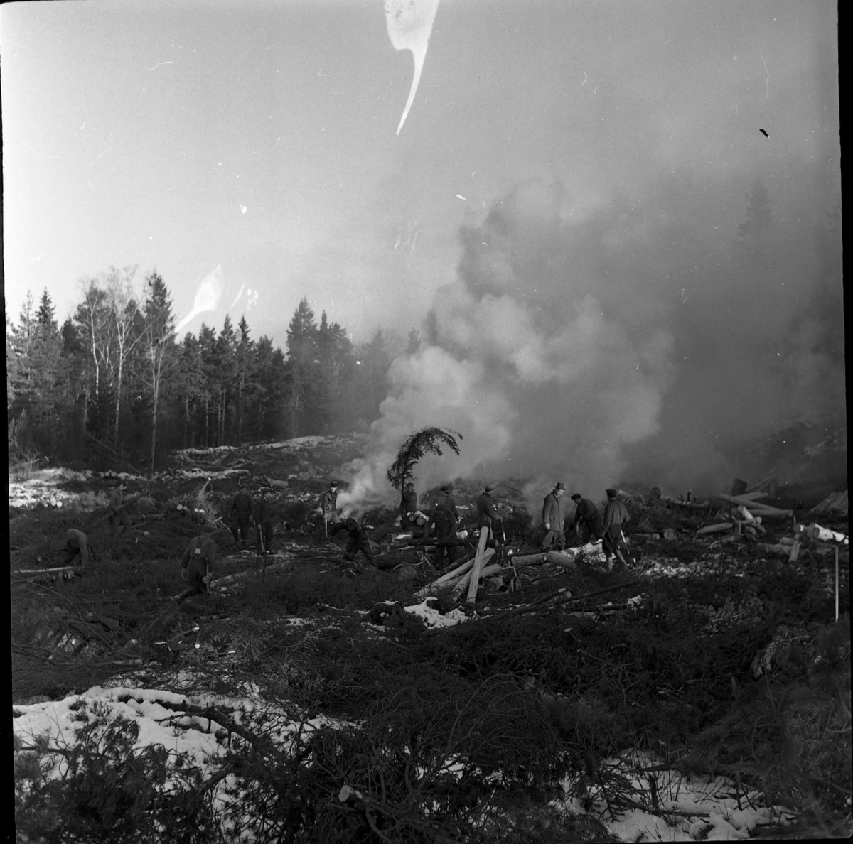Flera män arbetar med att barka av stockarna som ska bli till massaved. De eldar upp det färska granriset samtidigt.
