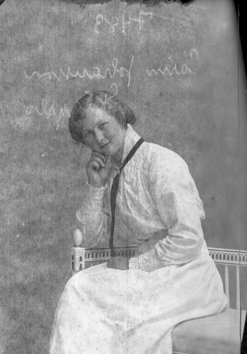 En ung kvinna i en småprickig ljus klänning sitter i en soffa. Kragen uppställd och ett smalt mörkt band runt halsen. Med höger arm på armstödet vilar hon huvudet i dess hand.