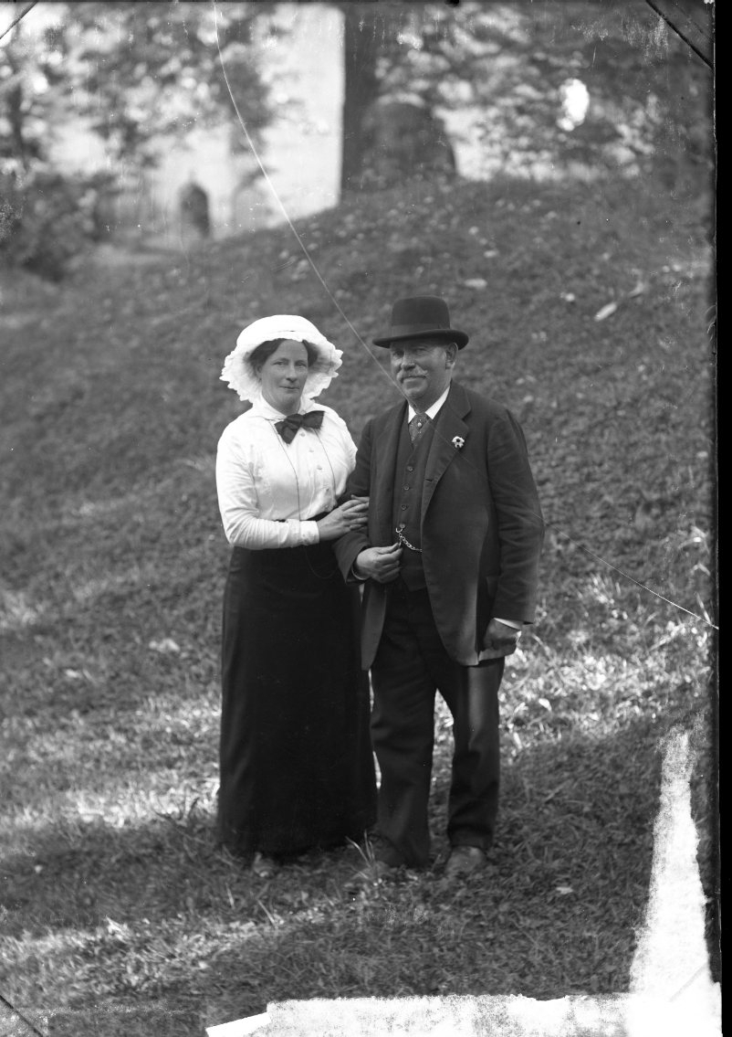 Ett finklätt äldre par står på en slänt nedanför Visingsborgs slottsruin. Mannen är kapten Carlsson på Visingsö.