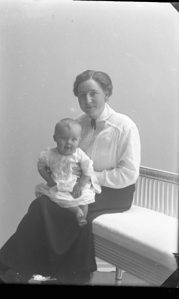 Porträtt av en kvinna som sitter i en soffa av gustaviansk stil med ett spädbarn i knät.
