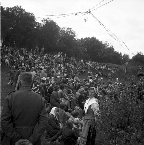 Bild över ett publikhav. De är utspridda över en gräsmatta. Skogen syns i bakgrunden.
