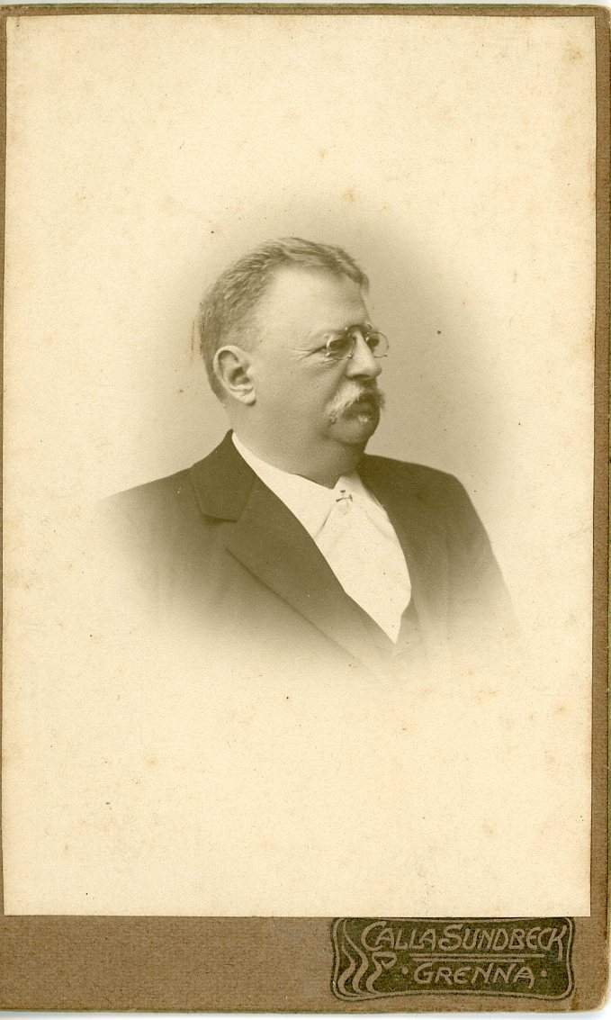 Kabinettsfotografi av en okänd man med mustasch och glasögon.